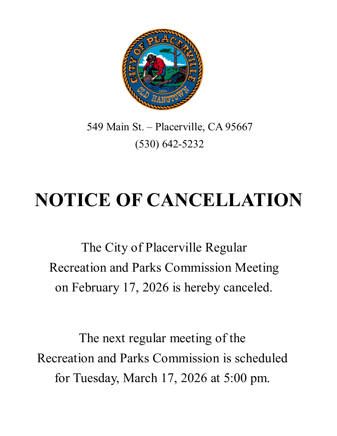 | Wednesday, February 22 5:00 PM | Special Joint Meeting of the Placerville City Council/Recreation & Parks Commisssion/Planning Commission |